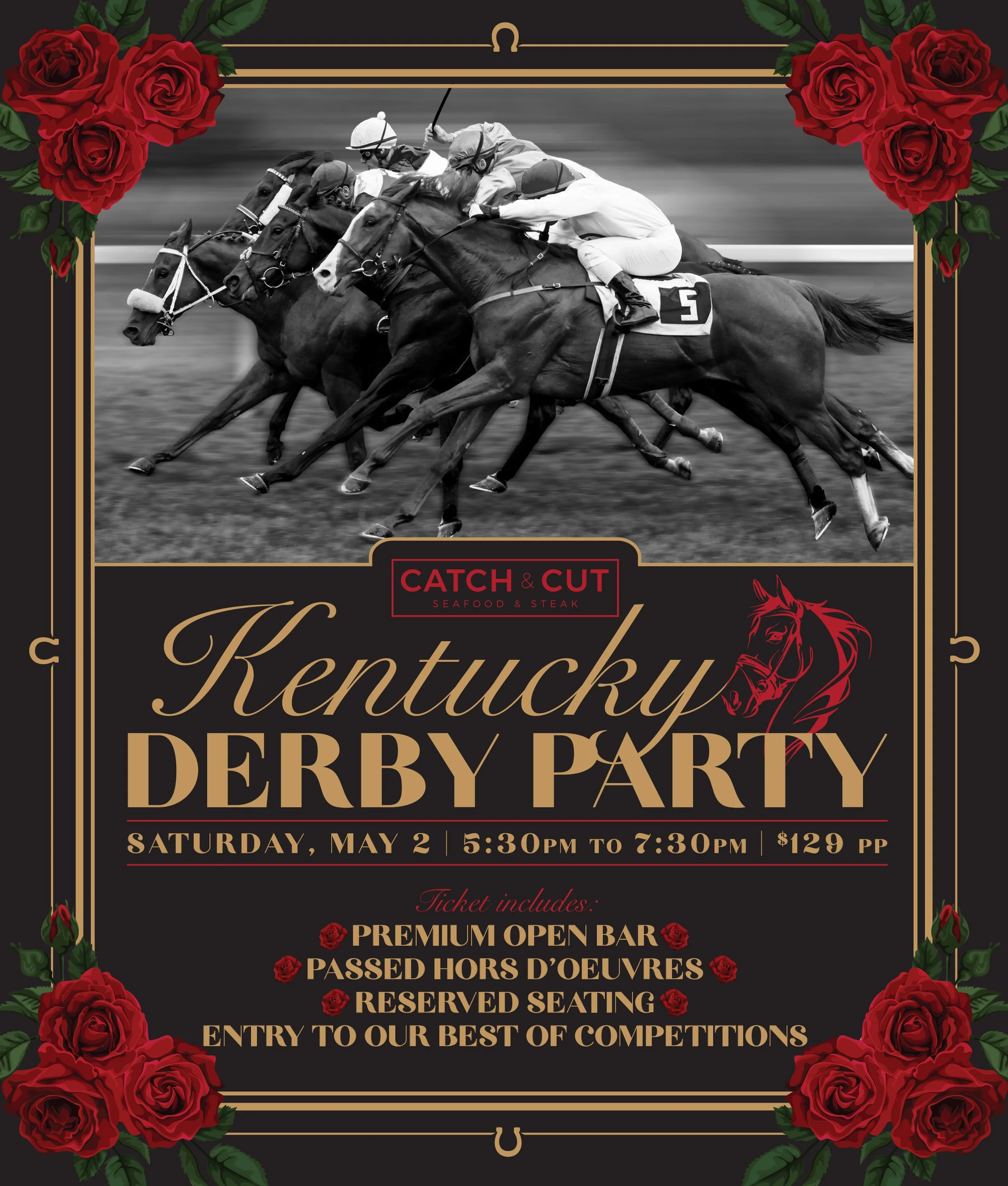 Whether you’re a longtime Derby enthusiast or simply looking for a stylish and memorable way to spend your Saturday, Catch & Cut offers the perfect setting to sip, socialize, and celebrate. Gather your friends, dress to impress, and join us for an unforgettable Derby Day experience.